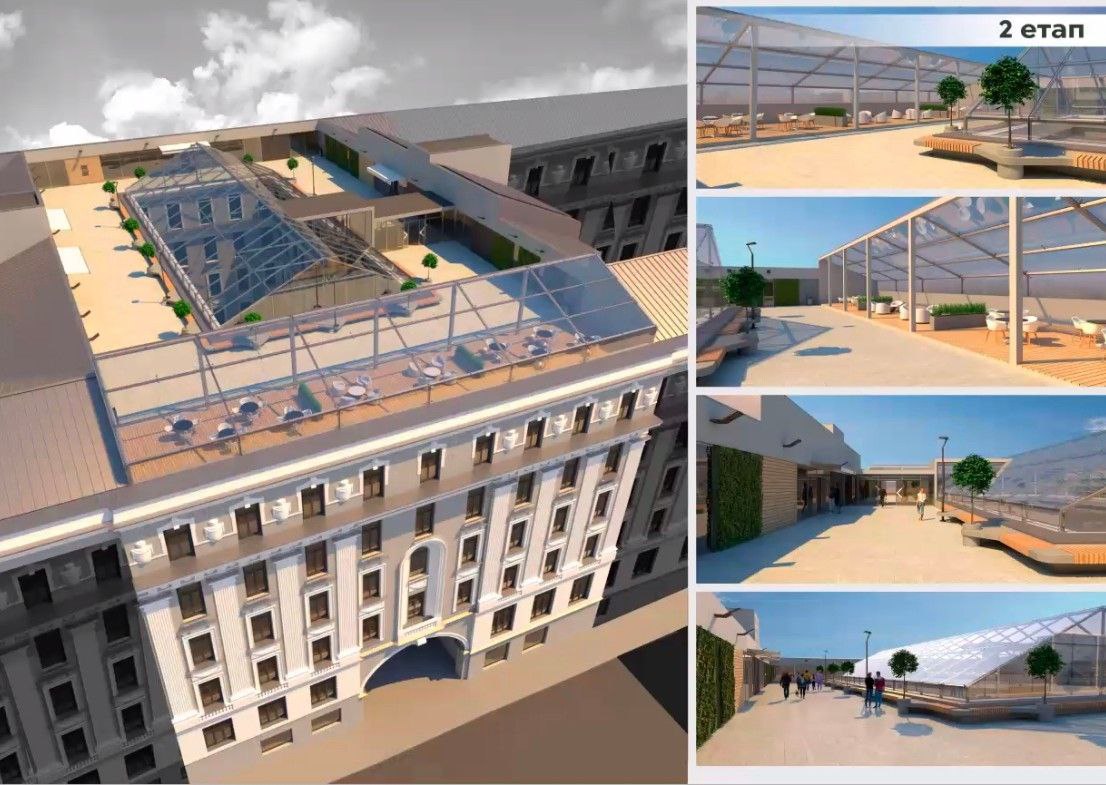 Концепція реконструкції Палацу Праці. На місті тераси зі столиками наразі розташований купол і скульптурна композиція, яка у концепції відсутня.